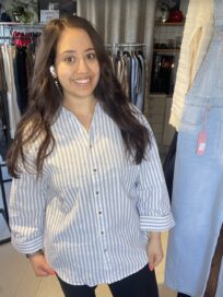 Härlig randig oversize skjorta med stora manschetter från Qnuz. Styla till ett par jeans och sneakers för en ledig look.