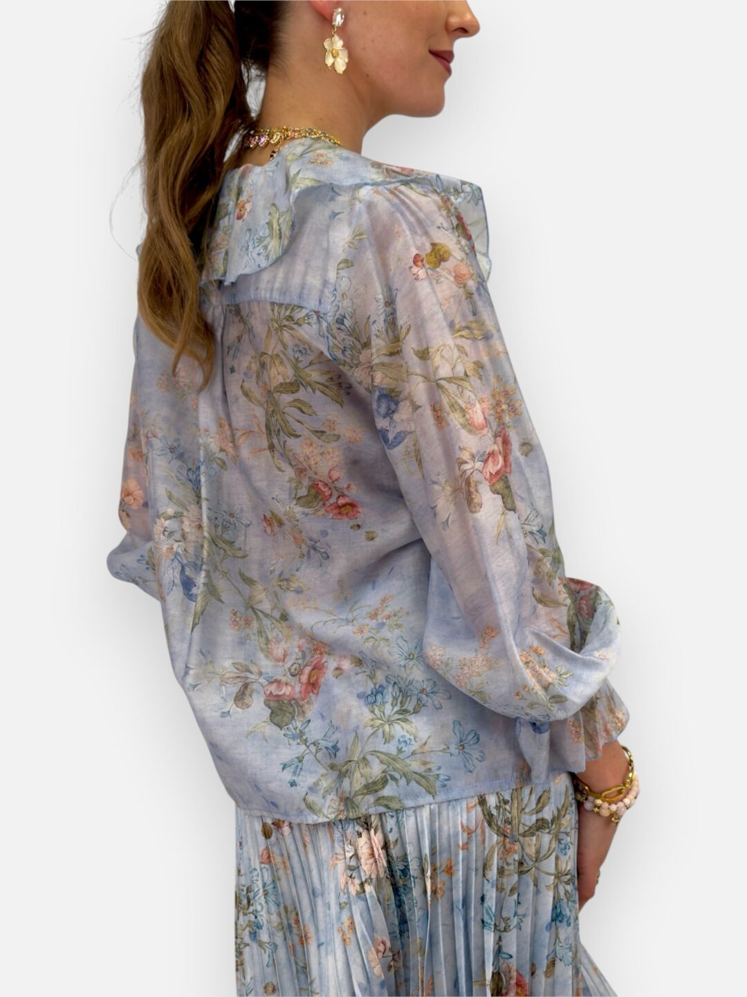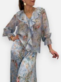 Sabine är blusen som får dig att vilja ta en extra sväng runt kvarteret. Den faller lätt och ledigt, medan det blommiga mönstret och de svepande volangerna skapar rörelse i varje steg. Romantisk, självsäker och med precis lagom dramatik – som att bära en hemlig kärlekshistoria mot huden.