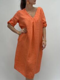 Wendy är en avslappnad linneklänning med vacker v-ringning och dekorativa veck framtill. Ärmarna kan bäras nedsläppta eller uppvikta och fästas med knapp. En mångsidig modell som passar både till vardags och ledigt.